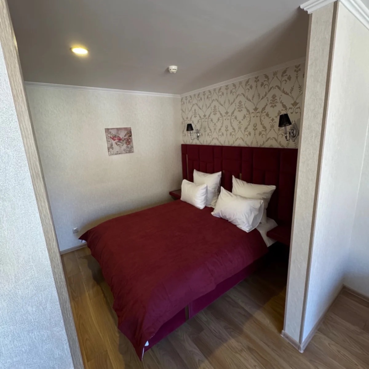 Квартира - студия кроватью в цвете насыщенно красной Бургундии! Из квартиры открывается прекрасный вид на горы!